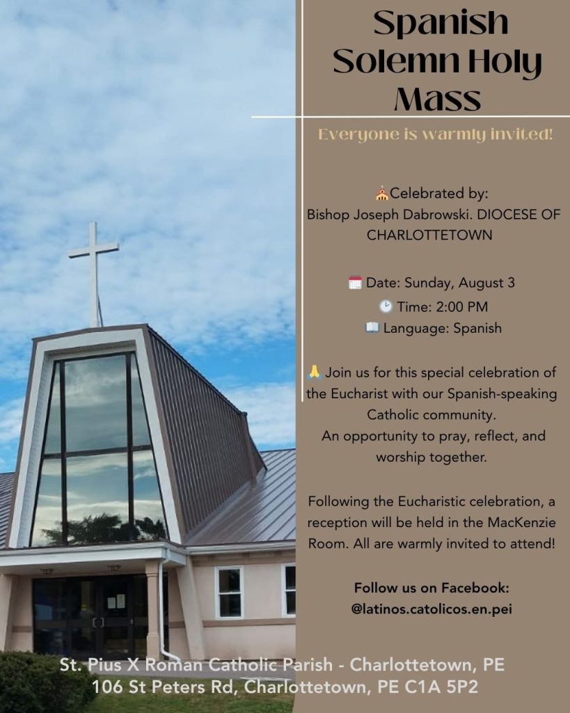 Everyone is warmly invited to join Bishop Joseph Dabrowski, CSMA, and the Spanish-speaking community of Prince Edward Island for a special celebration of the Eucharist at St. Pius X Parish in Charlottetown on Sunday, August 3, 2025, at 2:00 p.m.