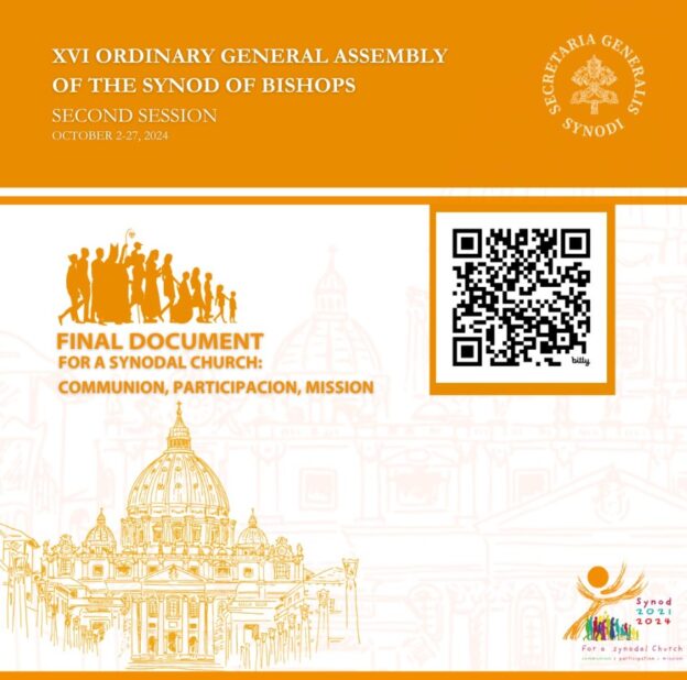 For a Synodal Church: Communion, Participation, Mission November 15, 2024 Friday morning, November 15, the English translation of final document from the second session of the 16th Synod of Bishops was released. Here is a link to the PDF. ENG—Documento-finale_traduzione-di-lavoroDownload Share this:Tweet Print (Opens in new window) Print