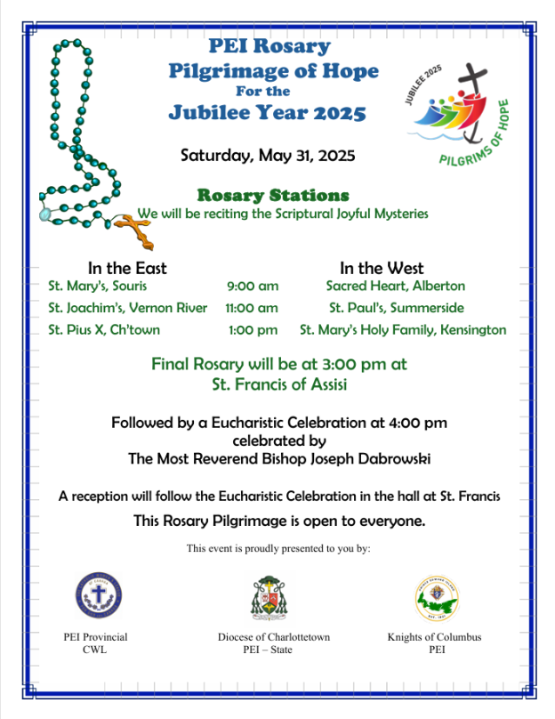 Our Diocesan journey through the Jubilee Year: Pilgrims of Hope continues with a Diocese-wide Rosary Pilgrimage, taking place on Saturday, May 31 at 9:00am. Two pilgrimage routes are available, one beginning at Sacred Heart Parish, Alberton, and another beginning at St. Mary’s Parish, Souris. Please see the poster below for more information about the time and locations of the pilgrimage routes. Pilgrims on both routes will join for the final Rosary at St. Francis of Assisi Parish in Cornwall at 3:00pm, followed by Mass at 4:00pm, and a reception.
