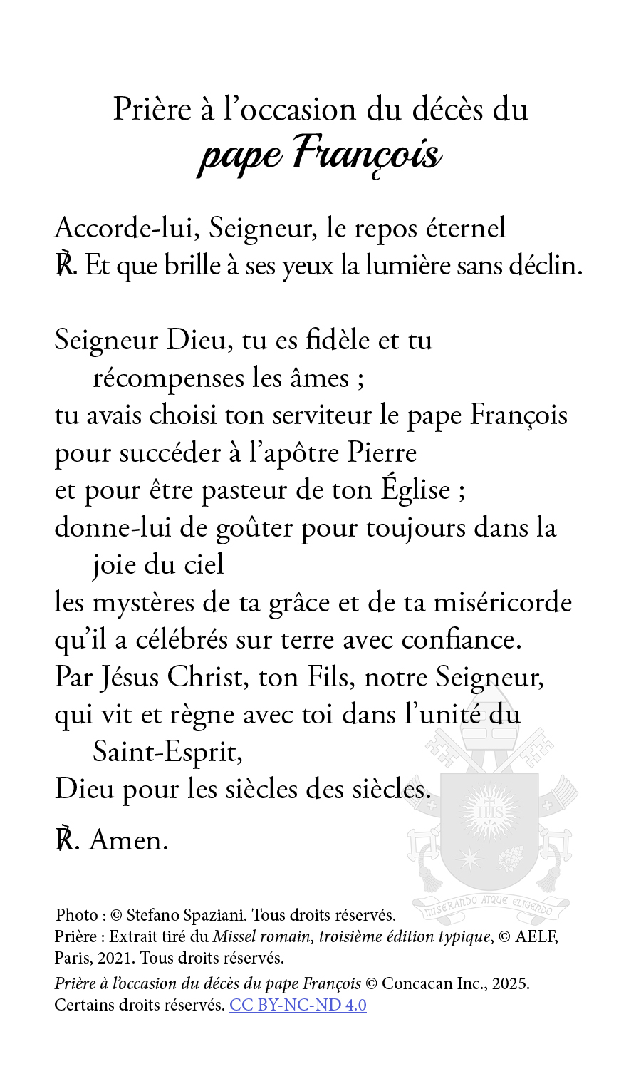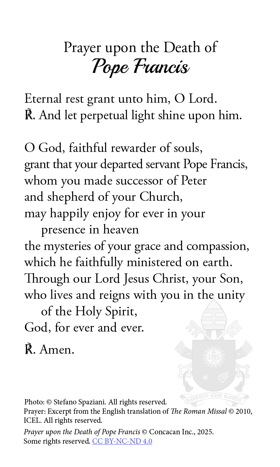 The publication arm of the Canadian Conference of Catholic Bishops have released a prayer card on the passing of Pope Francis. You can download it in English or in French. We are invited to pray this each day during the “Novemdiales,” the nine days of mourning for the Holy Father, which begins on Saturday, April 26.