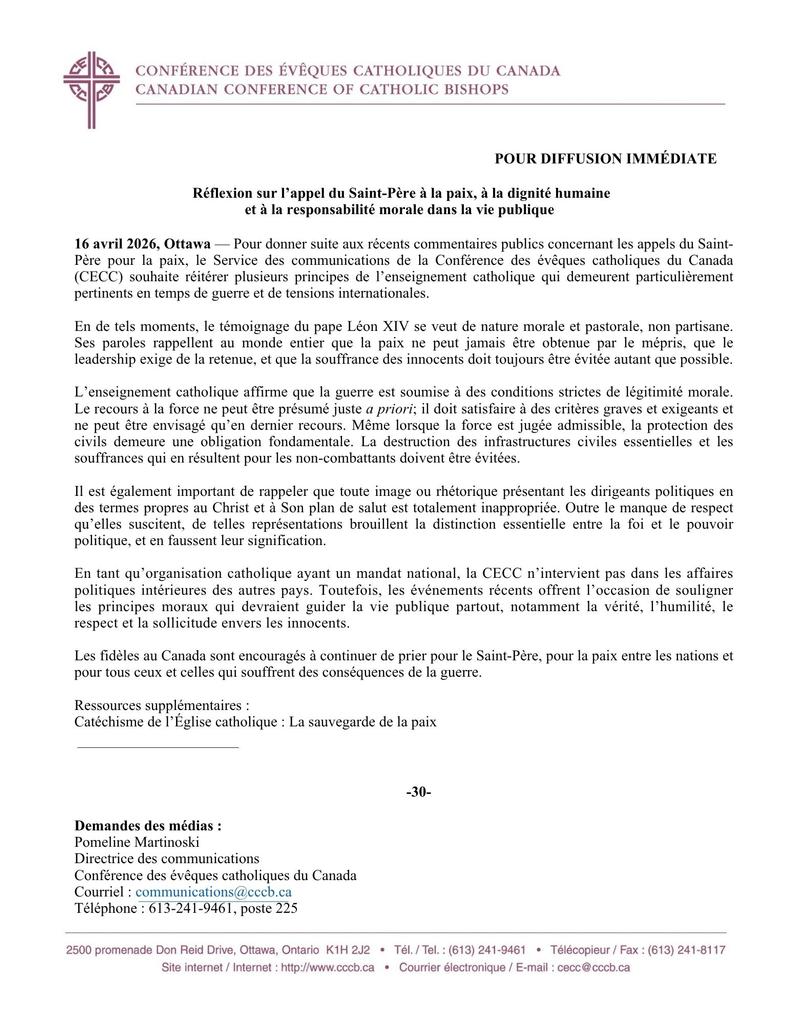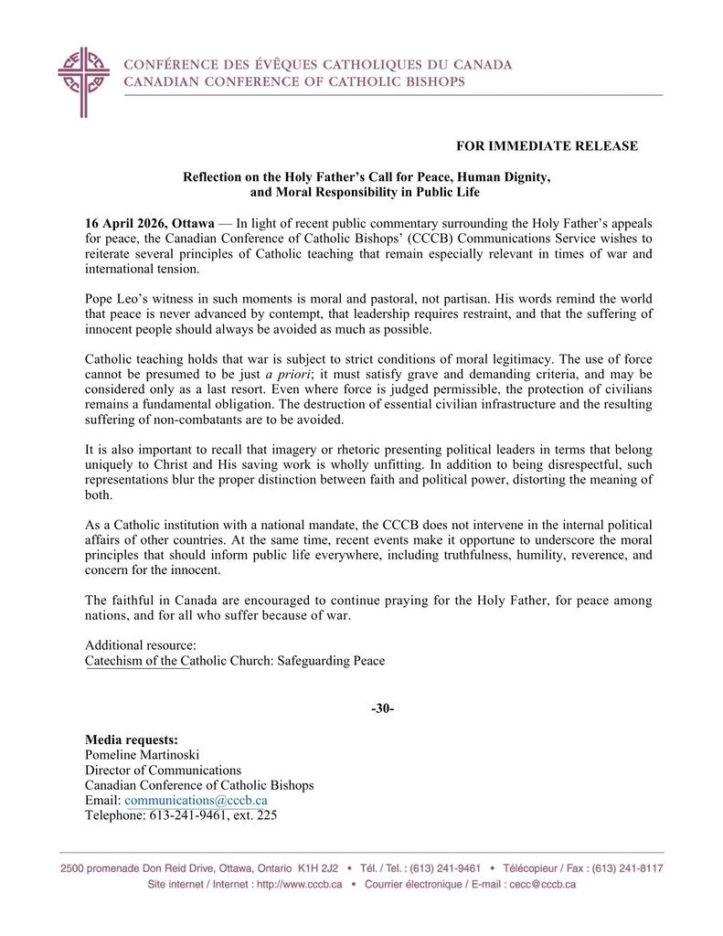 Press Release – April 16th, 2026 – Reflection on the Holy Father’s Call for Peace, Human Dignity, and Moral Responsibility in Public Life April 17, 2026 Share this:Tweet Print (Opens in new window) Print
