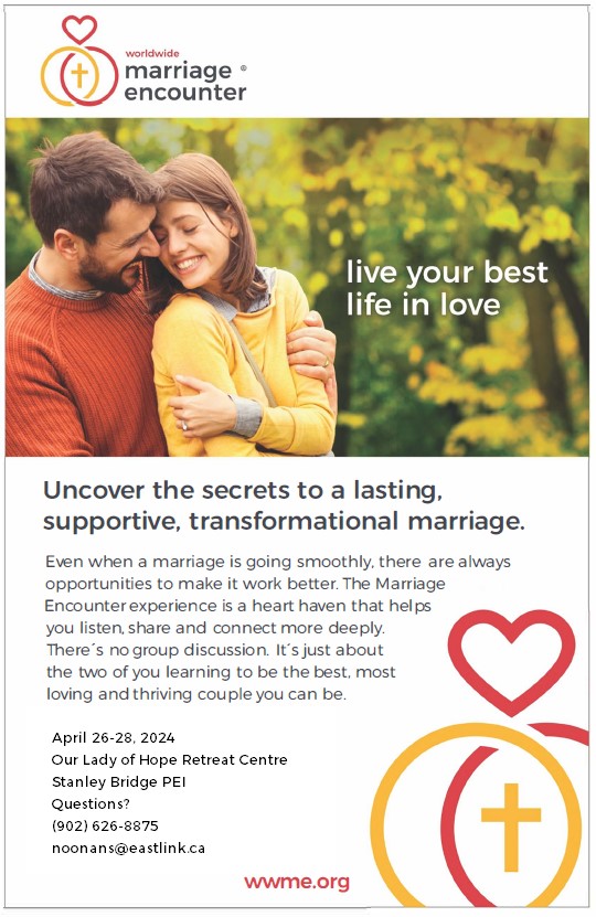 The next Marriage Encounter weekend will be held April 26-28, 2024 at Our Lady of Hope Retreat Centre, Stanley Bridge.