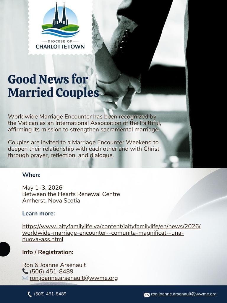 Couples, priests, and religious from across Atlantic Canada are invited to attend this prayerful and supportive weekend focused on strengthening relationships and deepening faith.